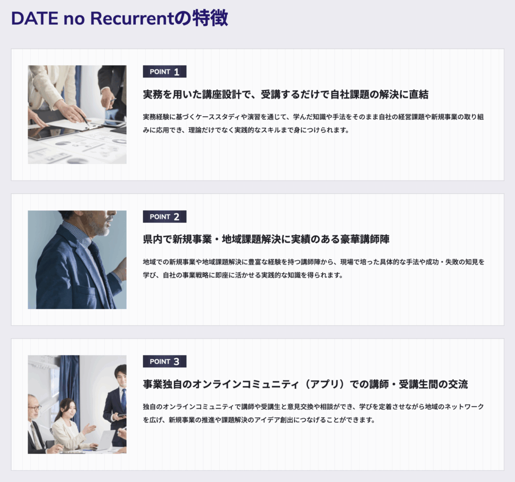 大学・研究機関・行政・金融機関とつながり、企業の成長を多面的に支援。人材育成と事業拡大を同時に後押しします。DATE no Recurrent(伊達のリカレント)は、東北大学・宮城大学・東北学院大学と産官が連携し、DXをはじめ幅広い学びを提供。宮城を舞台に多様な人材が交流しながら、未来のキャリアと企業成長を共に描くリカレント教育のプラットフォームです。